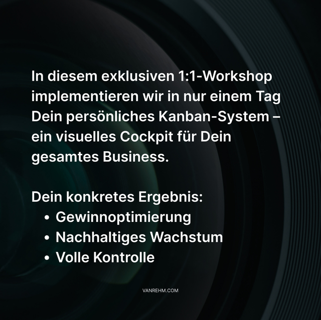 In diesem exklusiven 1:1-Workshop implementieren wir in nur einem Tag Dein persönliches Cashflow-System – ein visuelles Cockpit für Dein gesamtes Business. Dies ist die wichtigste Investition in Dein Unternehmen. Du erhältst nicht nur ein System, sondern eine neue Arbeitsmethode, die Dir dauerhaft mehr Zeit, mehr Klarheit und mehr Flow für Dein Business verschafft.